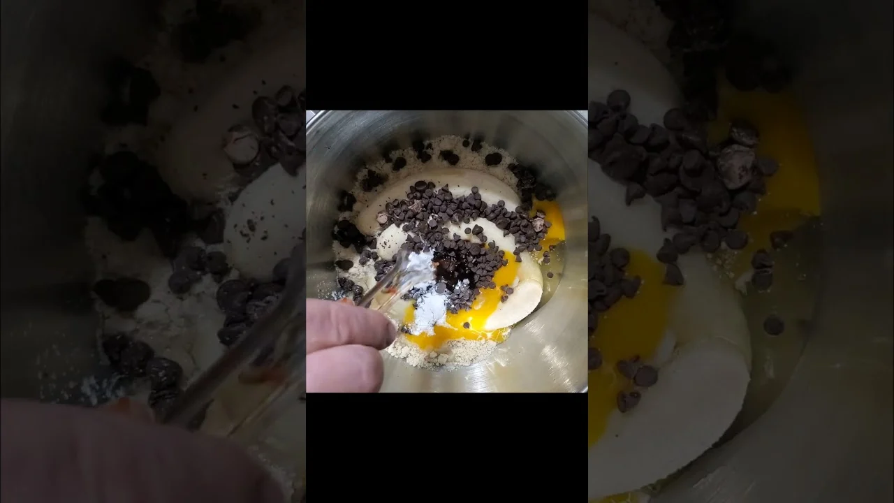 - Add the almond flour, baking soda, baking powder, and salt. Mix on low speed until the batter is uniform. Fold in the chocolate chips by hand.